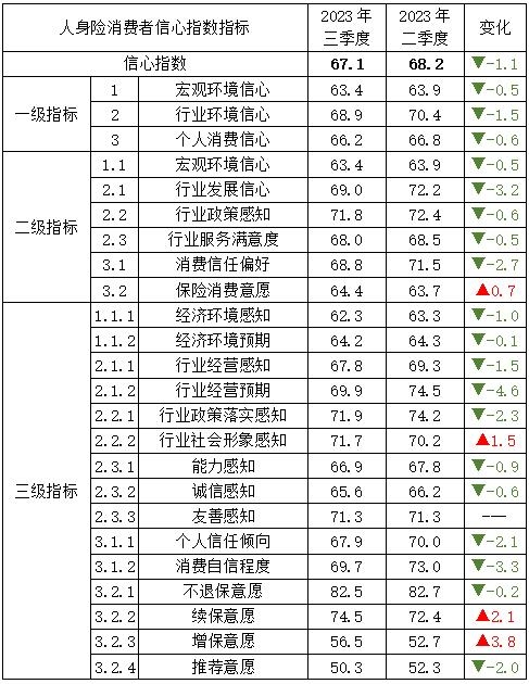 人身險(xiǎn)方面,三季度消費(fèi)者信心指數(shù)為67.1,環(huán)比下降1.1,同比上升4.0,處于信心較強(qiáng)區(qū)間,細(xì)分指標(biāo)呈現(xiàn)以下變動(dòng)趨勢:一是構(gòu)成指數(shù)的三個(gè)一級(jí)指標(biāo)環(huán)比均有所下降,行業(yè)環(huán)境信心和個(gè)人消費(fèi)信心處于信心較強(qiáng)區(qū)間,宏觀環(huán)境信心處于信心平穩(wěn)區(qū)間。三個(gè)一級(jí)指標(biāo)均高于2022年同期水平,行業(yè)環(huán)境信心和個(gè)人消費(fèi)信心高于2021年同期水平。二是構(gòu)成指數(shù)的六個(gè)二級(jí)指標(biāo)中,保險(xiǎn)消費(fèi)意愿環(huán)比上升,其余五個(gè)二級(jí)指標(biāo)環(huán)比有所下降。行業(yè)發(fā)展信心、行業(yè)政策感知、行業(yè)服務(wù)滿意度、消費(fèi)信任偏好均處于信心較強(qiáng)區(qū)間。